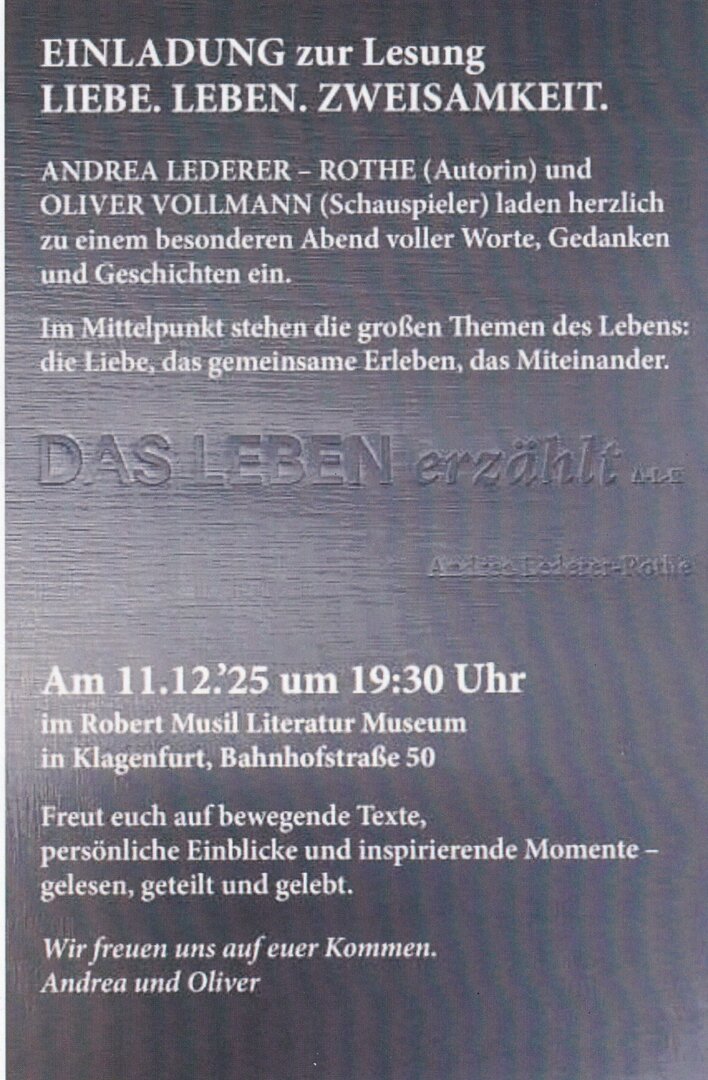 11. Dezember 2025, Beginn: 19:30 Uhr: Andrea Lederer-Rothe, Oliver Vollmann: Einladung zur Lesung Liebe.Leben.Zweisamkeit., ORT: VA Saal 1. Stock